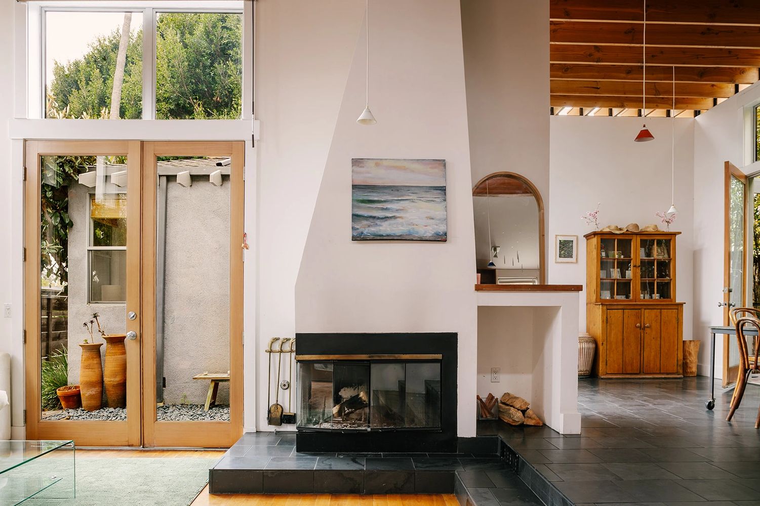 The primary residence is a 1,309 sq ft, 2-bedroom, 2-bath architectural gem that captures the essence of Venice’s effortlessly cool, coastal lifestyle. Vaulted ceilings and clerestory windows invite natural light to flood the space, while warm materials like light oak and cork flooring, whitewashed walls, and slate tile countertops create a soft, organic palette. The open-concept layout flows seamlessly from the living room to a cozy reading/TV nook, dining area, and a kitchen defined by a sculptural curved counter—perfect for both entertaining and everyday living. Eight-foot glass doors open to multiple decks and patios, blending indoor and outdoor living with ease.